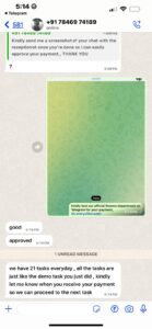 “We have 21 tasks every day, all the tasks like the demo tasks you did. Kindly let me know when you receive your payment so we can proceed to the next task.”