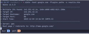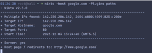 For demonstration, I can use the ‘path’ plugin on google.com. By default nikto runs all the plugins.