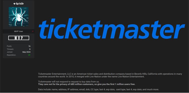 The First Million Stolen Records in the Ticketmaster Breach were Released for Free