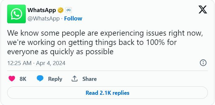 A statement was published on X. WhatsApp stating, “We are aware that some users are currently experiencing issues; we are diligently striving to restore everything to normalcy for all users in a timely manner.”